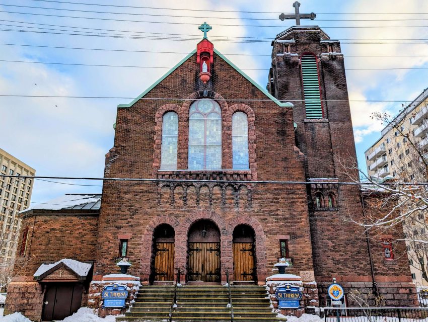 St. Theresa’s Parish is one of the best examples of Romanesque Revival architecture in Ottawa. Completed in 1930, the rich red brick and cut granite facade, the sturdy, square bell-tower and the interior’s rounded arches set this church’s architecture apart from the lighter, soaring style incorporated in Neo-Gothic churches. I visited the church at 95…