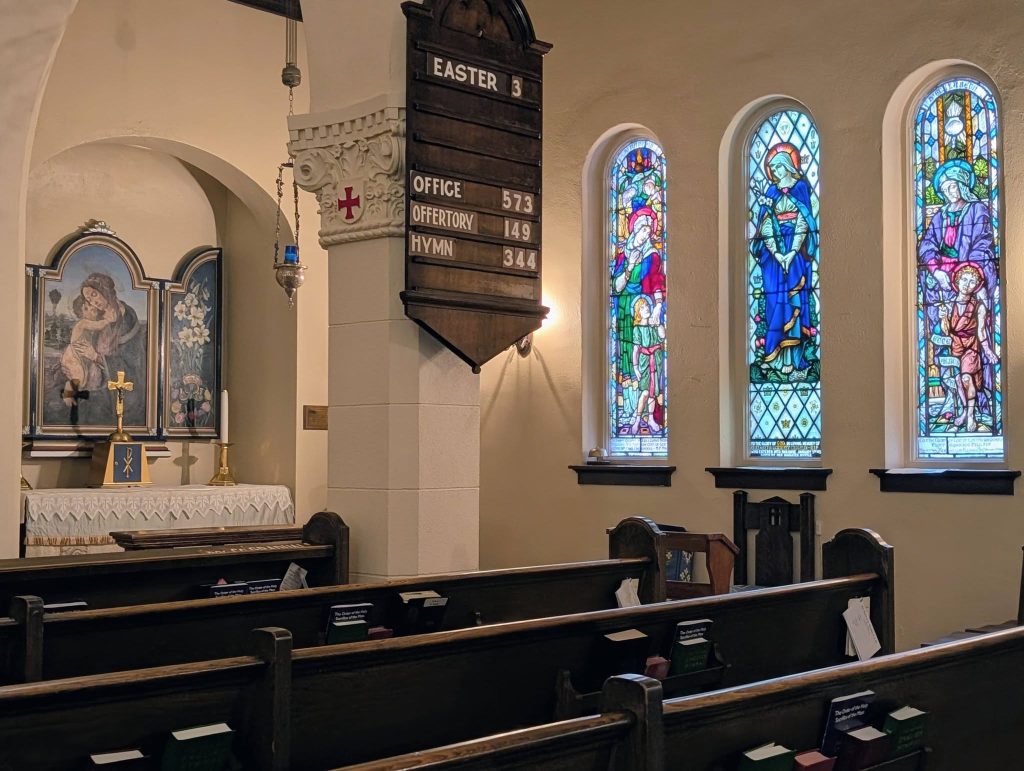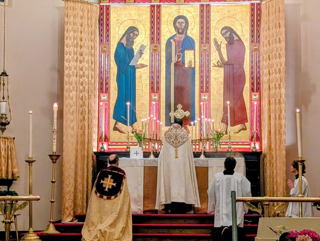 I arrived at the Anglo-Catholic Church of St. Barnabas, Apostle and Martyr on the cusp of dusk. The sounds of the robust parish choir rehearsing from the organ loft filled the church, while the herbal scent of incense from the morning liturgies lingered in the nave. And on April 19, the evening sun lingered too. It illuminated the church’s stained glass in a way that I didn’t experience when I last attended Evensong here — then in fall’s expanding darkness. I entered the historic Romanesque Revival church at 70 James Street, built in 1931, ten minutes before the start of the 7:15 PM Solemn Evensong. The wood panel sacred art above the altar, or the triptych, lends the space a Byzantine grandeur. By the start of Evensong, around 50 people had gathered at this downtown church.