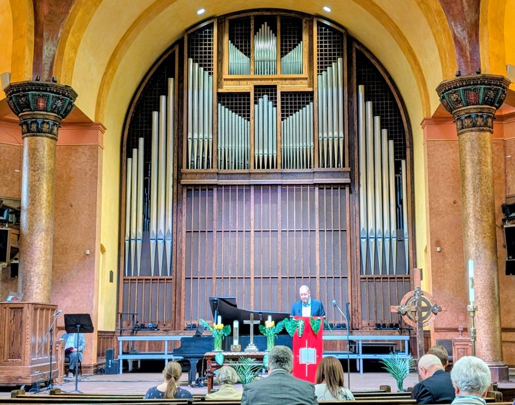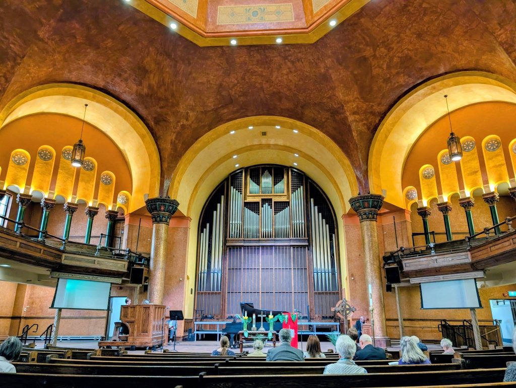 Built in 1912, with a Neo-Byzantine sanctuary that can accommodate over 800 faithful in pews and an imposing Romanesque Revival exterior, Dominion-Chalmers United Church at 355 Cooper Street is among Ottawa’s early twentieth-century architectural gems. On Palm Sunday, I joined 40 members of this small, but engaged congregation for their 10:30 AM Sunday service. While the church community sold the heritage building to Carleton University in 2018, thus freeing itself of the considerable upkeep expenses, the faithful lease back the sanctuary and other spaces. The sheer grandeur of that sanctuary is striking.  The cupola above, the meticulously painted columns, the rounded archways and the light streaming in through the yellow stained glass are together reason enough to arrive early to the service and take in the architecture. The congregation’s continued presence keeps alive the Christian faith in this landmark building — one that now serves as an arts and performance venue.