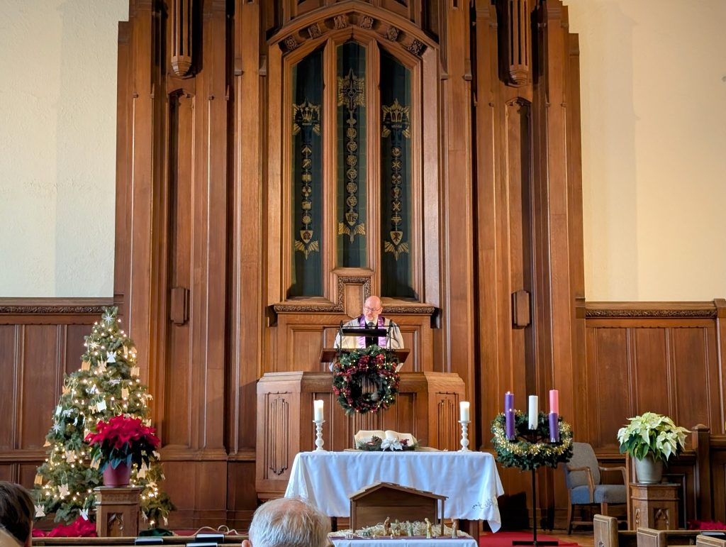 The service included the lighting of the fourth Advent candle, with the words: “We light the Fourth Advent candle, the light of love. The light shines in the darkness, and the darkness does not overcome it.” The congregation responded with: “God is love, and if we live in love then we live in God, and God lives in us.” The community’s Associate Minister, Ema Prince, invited a handful of children to gather around a Christmas tree in the sanctuary, where she offered a brief children’s reflection. Reverends Prince and Perkin, alongside the congregation’s youth, proceeded to add stars to the Christmas tree.