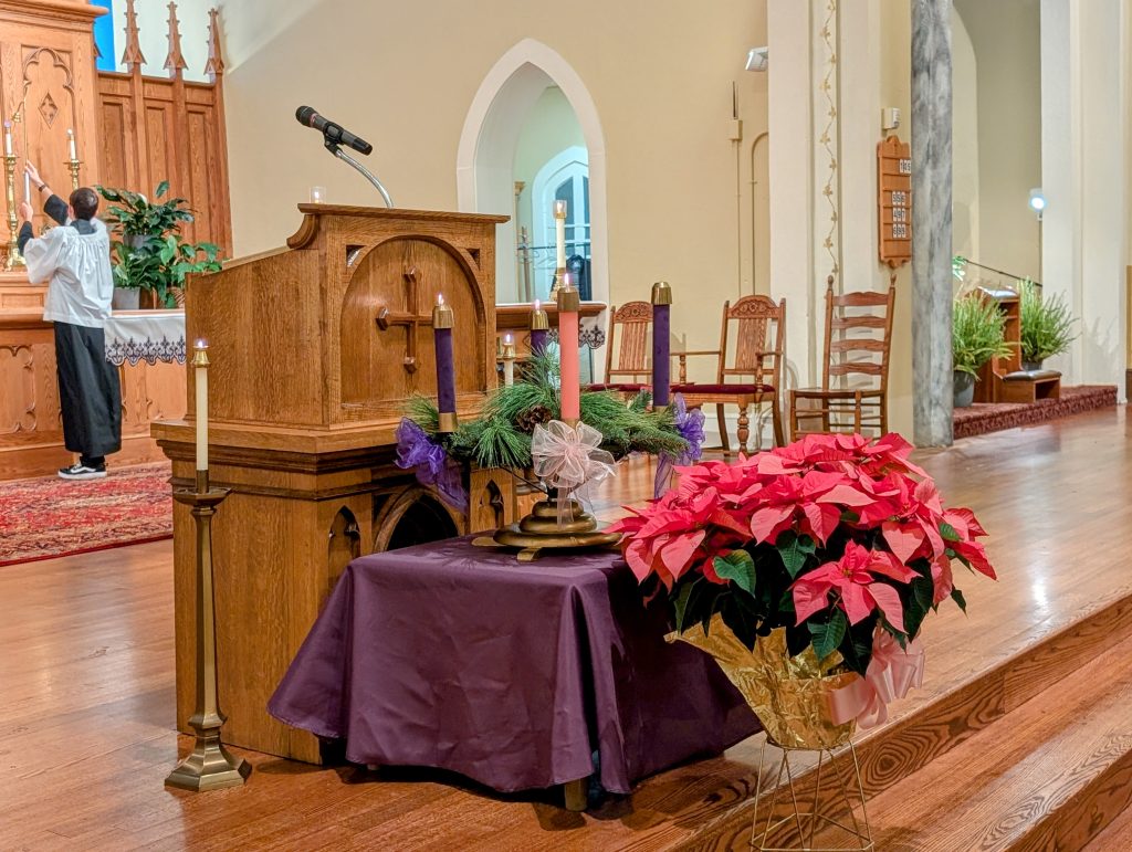 Located 1,100 kilometres southwest of Ottawa, St. Mary’s Church in Chillicothe, Ohio certainly lives up to this publication’s “Farther Afield” category. I had just spent two days visiting a friend in this town situated an hour south of Columbus when I decided to attend Mass at St. Mary’s, one of three Roman Catholic church sites that together comprise Our Lady, Queen of the Apostles Parish. The snow had started falling that afternoon and once the 5:00 pm Vigil Mass had begun on December 13, a mighty winter storm was in full swing. Thick clumps of wet snow clung to branches. Chillicothe resembled a veritable Christmas wonderland. I was here to attend the Mass for Gaudete (Joy) Sunday. In the Catholic liturgical tradition, Saturday evening (Vigil) Masses are effectively Sunday Masses.