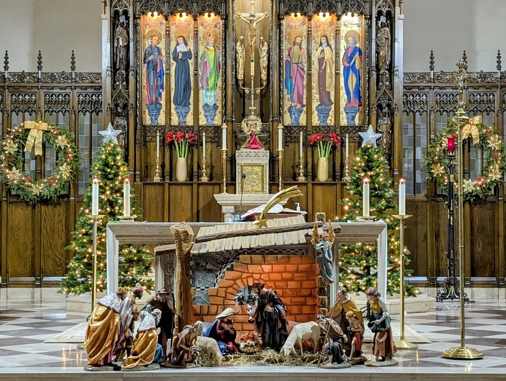 On December 27, still solidly the Christmas season in the Roman Catholic liturgical year, the sanctuary was beautifully decorated with a Nativity scene, two lit Christmas trees, and wreaths.