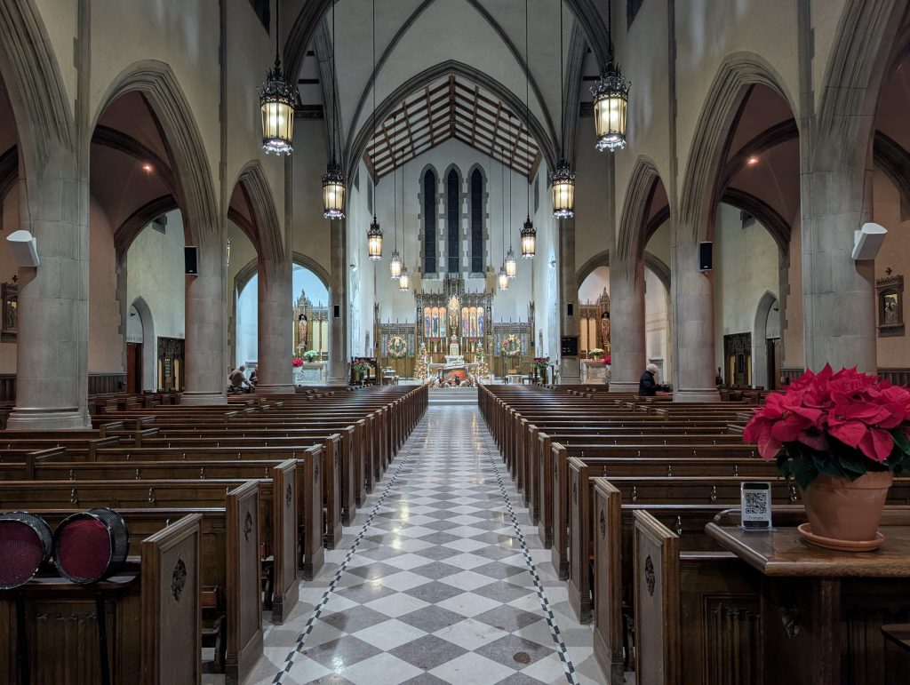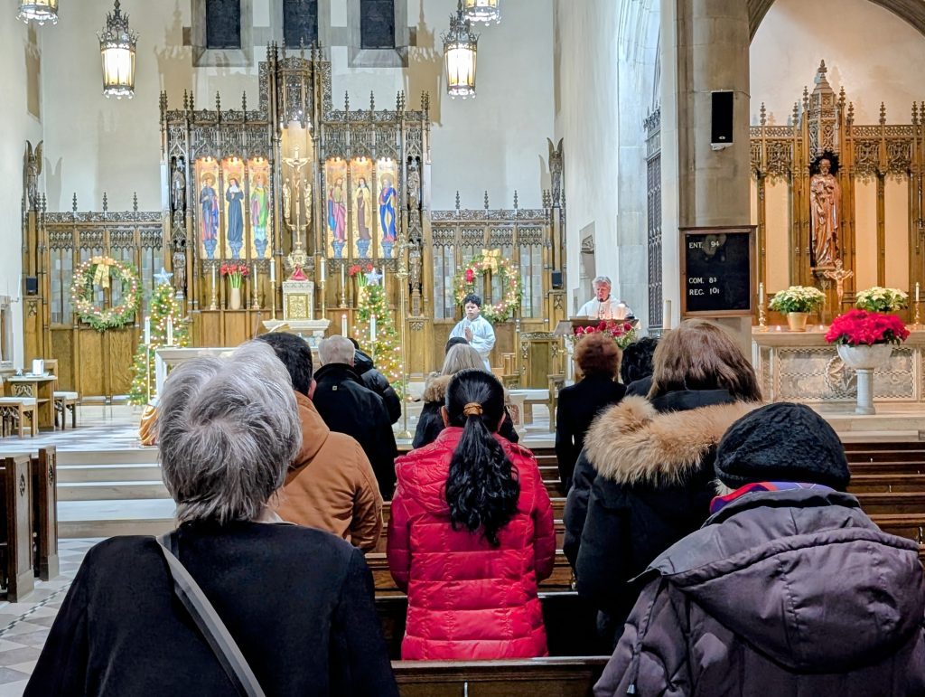 The Parish has a robust music ministry, bolstered by the addition of four students from McGill University’s Schulich School of Music to the church choir, as section heads. While the full choral experience is reserved for Sunday 10:30 AM Mass, the Saturday evening liturgy was accompanied by an organist, who played the Casavant pipe organ installed in 1930, along with a cantor singing from the choir loft. Joel Peters, originally from Saskatchewan, directs the Parish’s music ministry and is a composer in his own right. “O Little Town of Bethlehem” served as the entrance hymn, while during Communion we sang “Away in a Manger,” followed by “Once in Royal David’s City” as the recessional hymn.